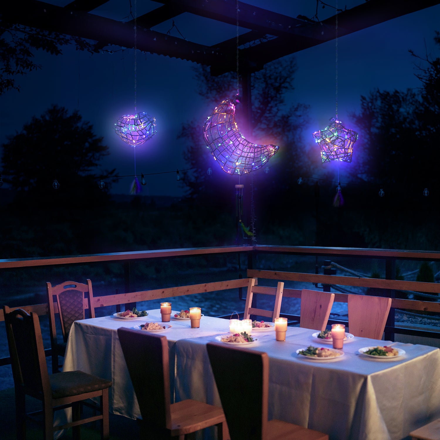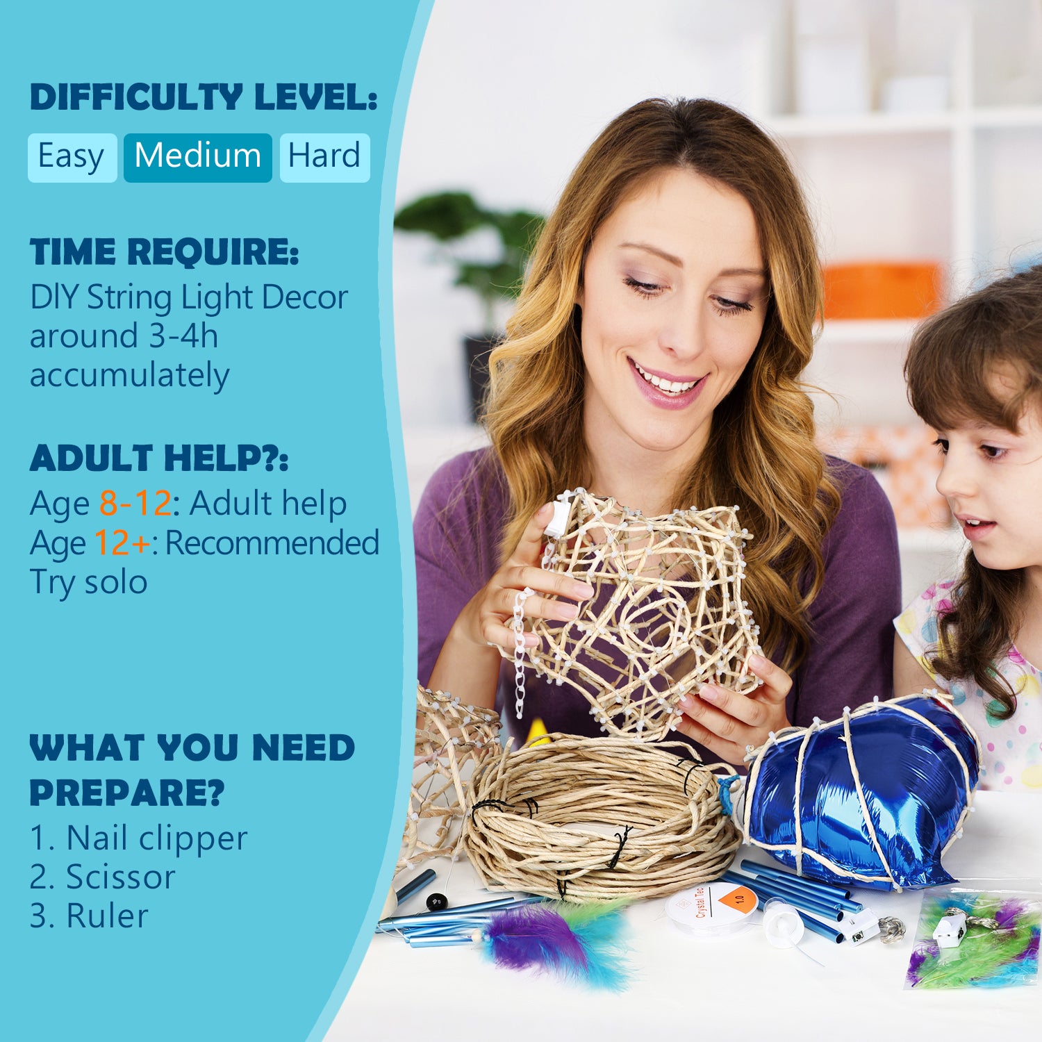 All-in-One Creative Fun: 3 Projects in 1 Kit - This complete arts and crafts set lets kids create 3 dazzling projects: 3 glowing 3D string light sculptures (Heart, Star, Moon). Everything is included: 3 foil balloons, 600+ zip ties, natural paper strings, 3 spray paints (Blue, Green, Purple), a brush, feathers, aluminum tubes, and 18.75ft multi-color LED string with 60 bulbs. No need to buy anything else.