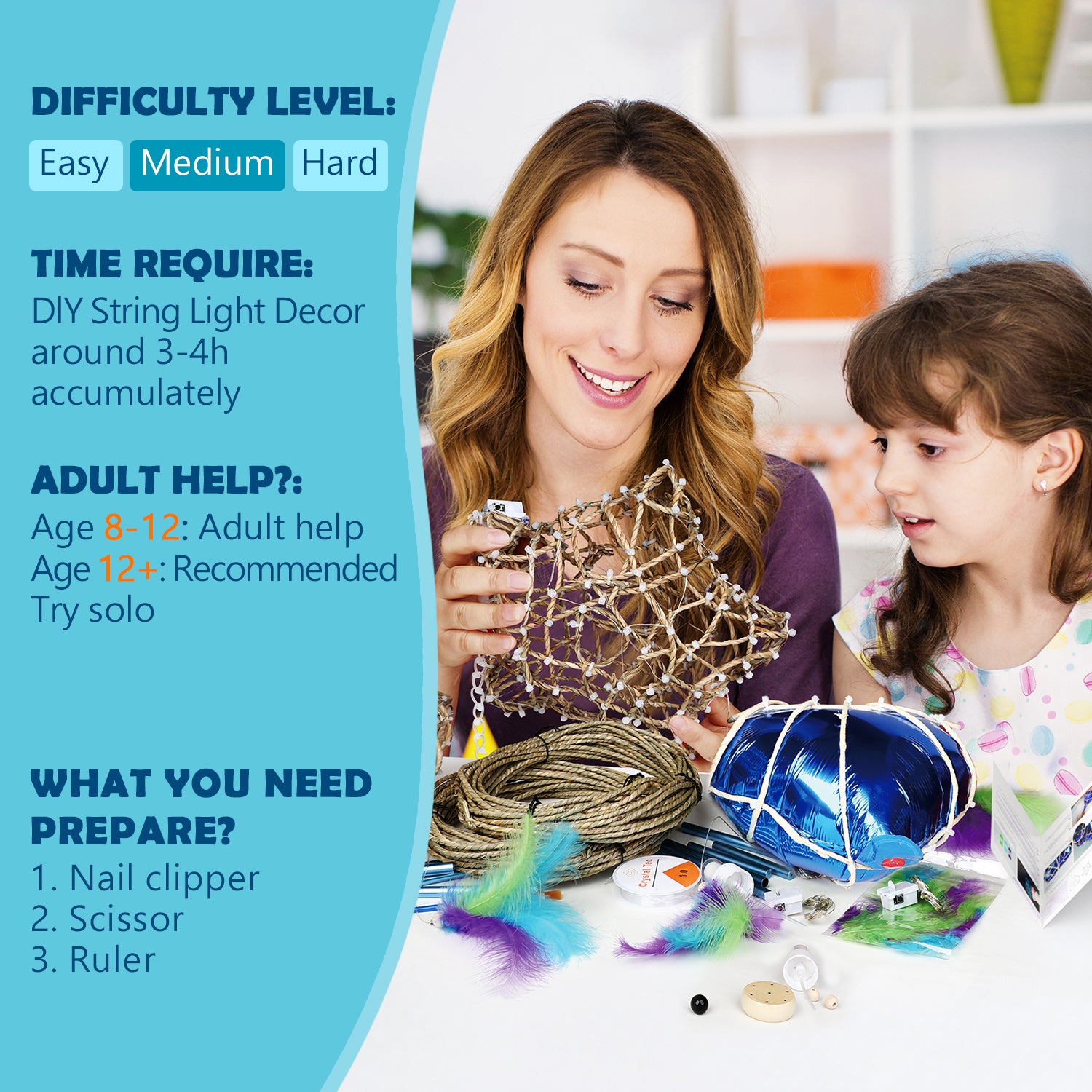 All-in-One Creative Fun: 3 Projects in 1 Kit - This complete arts and crafts set lets kids create 3 dazzling projects: 3 glowing 3D string light sculptures (Heart, Star, Moon). Everything is included: 3 foil balloons, 600+ zip ties, natural paper strings, 3 spray paints (Blue, Green, Purple), a brush, feathers, aluminum tubes, and 18.75ft multi-color LED string with 60 bulbs. No need to buy anything else.