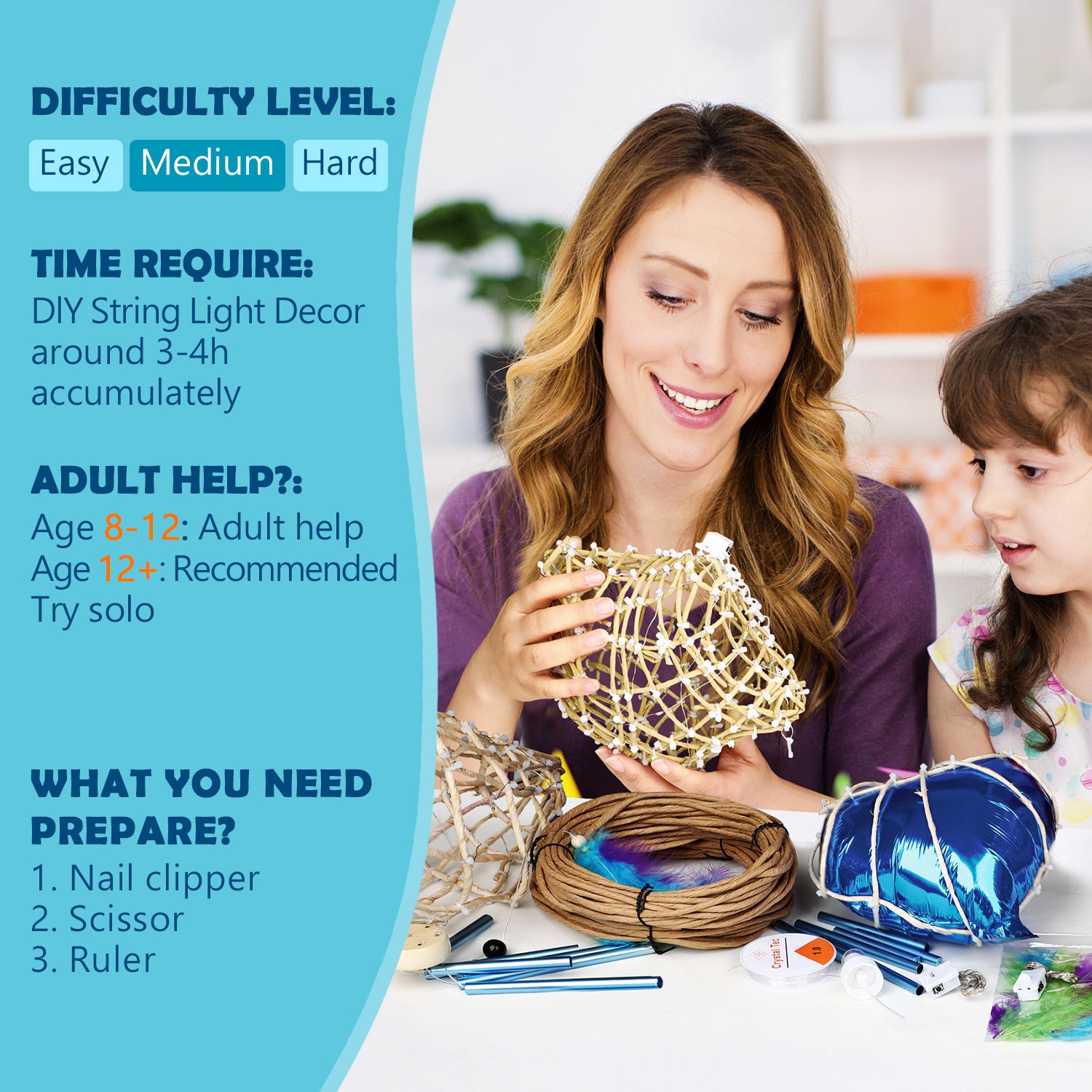 Enough Material for 3 Projects - Our 3D string light craft kit comes with 3 foil balloons, 600pcs zip ties and natural paper strings. Apply 3 spray paints to mix colors for your 3D string lights. Paint brush is supportive for pixel-perfect touch-ups. 3 colors feathers, 6 different length aluminum tubes, 1 wooden block, 1 striking bead, 3 wooden beads and 1 nylon threading rope, which is enough to make 1 wind chime and 2 feather décors. A total of 18.75ft multi-color light strings with 60 bulbs will be enough for you to décor 3 projects.
